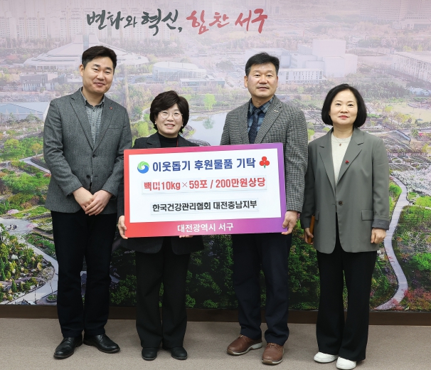 [무한뉴스=정민정 기자] 대전 서구는 15일 한국건강관리협회 대전·충남지부(대표 김인원)로부터 백미 10kg 59포(200만 원 상당)를 기탁받았다.