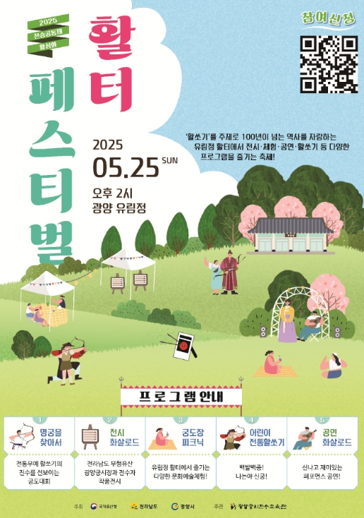 주요 프로그램으로는 활쏘기의 예법과 정신을 조명하는 ‘예를 품어 활을 쏘다’, 전통 활터 공간을 재해석하는 ‘활터의 전통문화 터편사’, 전문가들과 활쏘기 문화를 깊이 있게 논의하는 ‘전통활쏘기 포럼’ 등이 마련돼 있다.