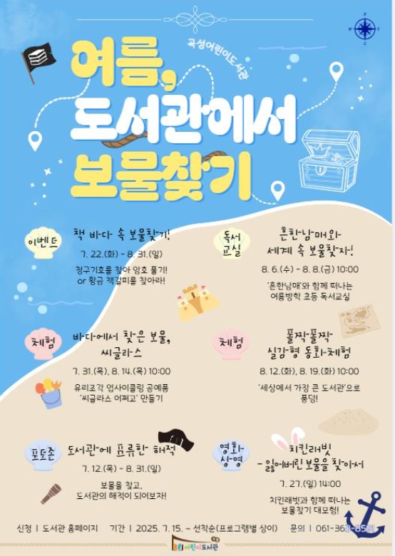 [무한뉴스=정민정 기자] 곡성군은 여름방학 기간인 오는 7월 22일부터 8월 31일까지 ‘여름, 도서관에서 보물찾기”라는 주제로 곡성어린이도서관에서 지역민을 위한 다양한 독서문화 행사를 운영한다고 14일 전했다.