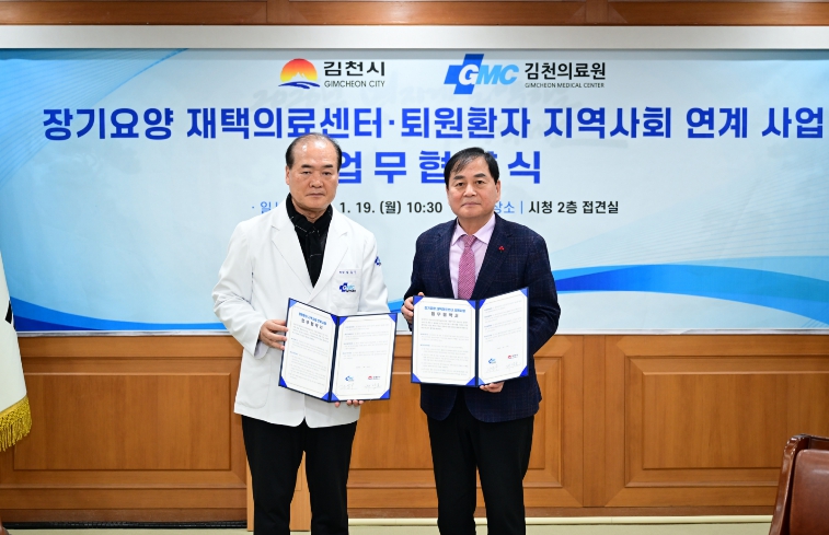 [무한뉴스=최진수 기자] 김천시는 1월 19일 김천의료원과 함께 ‘장기요양 재택의료센터 시범사업’과 ‘퇴원환자 지역사회 연계 사업’ 추진을 위한 업무협약을 체결했다.