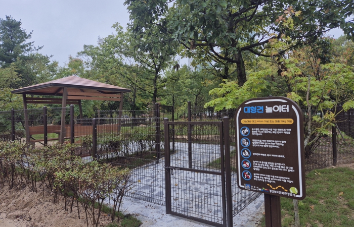 반려견 놀이터는 중‧소형견 구역(25kg 미만, 1,100㎡)과 대형견 구역(25kg 이상, 600㎡)으로 구분되어 있으며, 놀이기구‧파고라‧벤치‧순환 산책로 등 다양한 편의시설을 갖췄다.