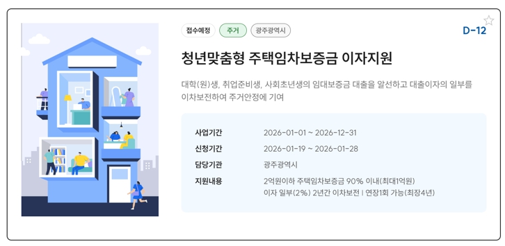 [무한뉴스=정민정 기자] 광주광역시는 무주택 청년의 주거비 부담 완화를 위한 청년맞춤형 주택임차보증금 이자지원 사업 대상자를 19일부터 모집한다.