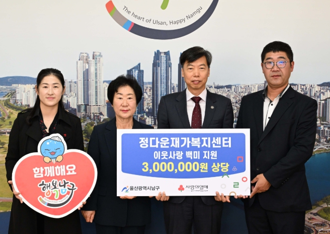 [무한뉴스=최진수 기자] 정다운재가복지센터는 17일 남구청을 방문해 백미 10kg 100포(300만 원 상당)를 울산사회복지공동모금회에 지정기탁했다.