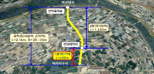 먼저 1공구인 백석저수지부터 전당네거리까지 0.65㎞ 구간은 지난 6월 착공한 상태로, 과학로 전체 구간에 편입되는 268필지(8만9709㎡) 중 국토교통부와 농림축산식품부 소유의 국유재산 78필지(7만4575㎡)에 대해 조달청과 지속적인 협의 결과 53필지(5만9368㎡)에 대한 무상귀속(새로 설치한 공공시설의 소유권이 법률에 따라 관리청에 무상으로 이전되는 제도) 행정 절차가 완료돼 편입부지 매입에 필요한 예산을 절감할 수 있게 됐다.