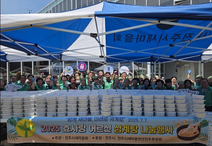 [무한뉴스=정민정 기자] 전주시새마을회(회장 송병용)가 7일 무더위에 지친 어르신들을 여름 보양식으로 위로하기 위해 '2025 효사랑 어르신 삼계탕 나눔 행사'를 가졌다.