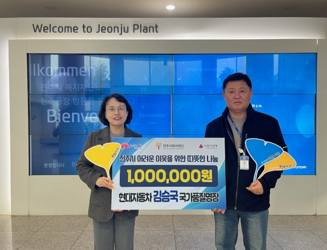 [무한뉴스=정민정 기자] 현대자동차 전주공장 김승국 국가품질명장은 16일 전주시복지재단에 어려운 이웃을 위한 성금 100만 원을 기탁했다.