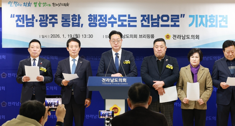 [무한뉴스=정민정 기자] 나광국(더불어민주당·무안2)은 1월 19일 13시 30분 전남도의회 브리핑룸에서 기자회견을 열고, “향후 출범할 통합 지자체의 행정청사와 자치단체장의 근무지는 반드시 현재 전남도청이어야 한다”고 강력히 주장했다.