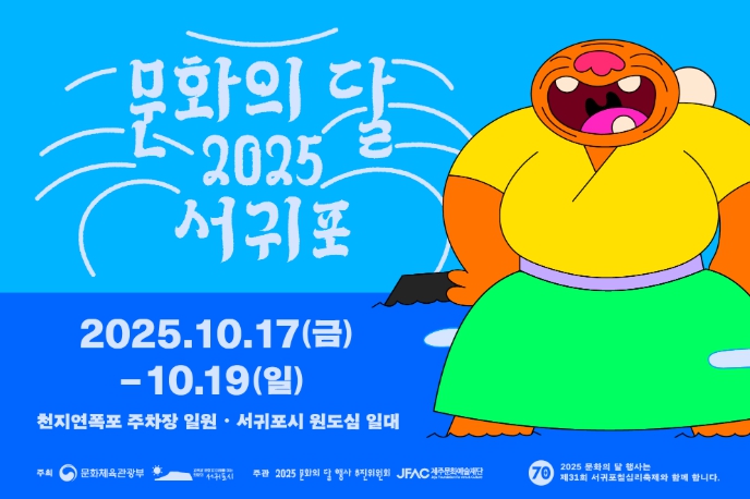 한편 `2025 문화의 달' 행사는 천지연폭포 주차장, 자구리공원, 서귀진지 등에서 열리며, 대한민국 대표 혼성밴드 자우림과 하이브리드 밴드 엔플라잉을 비롯, 세계적인 재즈 트럼펫 연주자인 이브라힘 말루프, 콜롬비아 대표 월드뮤직 밴드 프렌테 꿈비에로, 서커스 기반 공연 `혼둘혼둘'(원통 위에서 공연 등), 제주 해녀가 참여하는 극단 코끼리들이 웃는다의 `물질'(물 담긴 수조 속 공연) 등 다채로운 공연이 펼쳐질 예정이다.