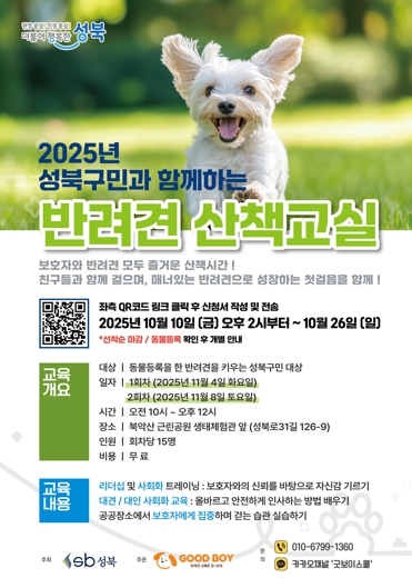 [무한뉴스=정승훈 기자] 서울시 성북구가 11월 4일과 8일 전문가와 함께하는 체험형 반려견 산책교육을 실시한다. 이번 교육은 성북구민과 반려견이 함께 참여해 산책 습관과 사회화 훈련을 배우는 프로그램이다.
