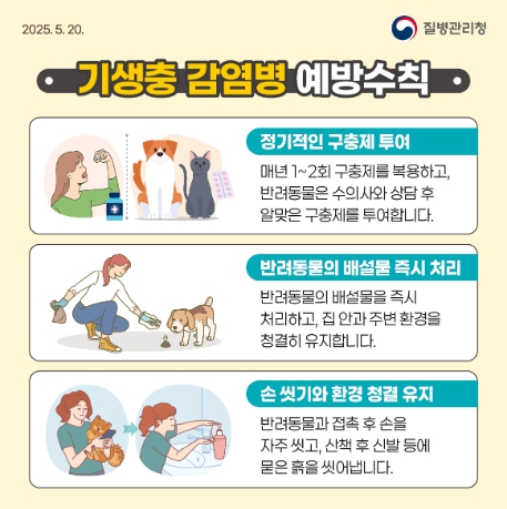 질병관리청이 권고하는 주요 예방수칙으로는 ▲반려동물 접촉 전후 손 씻기 ▲배설물 처리 후 위생 관리 철저 ▲정기적인 구충제 투여 및 건강검진 ▲반려동물 위생용품 관리 및 청결 유지 ▲외출 후 의복, 신발 세척 등 관리 등이 있다.