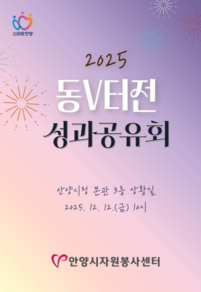 [무한뉴스=정승훈 기자] 안양시자원봉사센터는 오는 12일 시청 본관 3층 상황실에서 자원봉사 거점센터 동V터전 코치 150여 명을 대상으로 ‘2025 동V터전 성과공유회’를 개최한다고 11일 밝혔다.