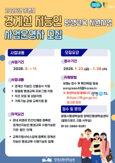 [무한뉴스=정승훈 기자] 광명시는 ‘2026년 광명시 경계선지능인 평생교육 운영 지원사업’을 수행할 보조사업자를 오는 28일까지 공개 모집한다.