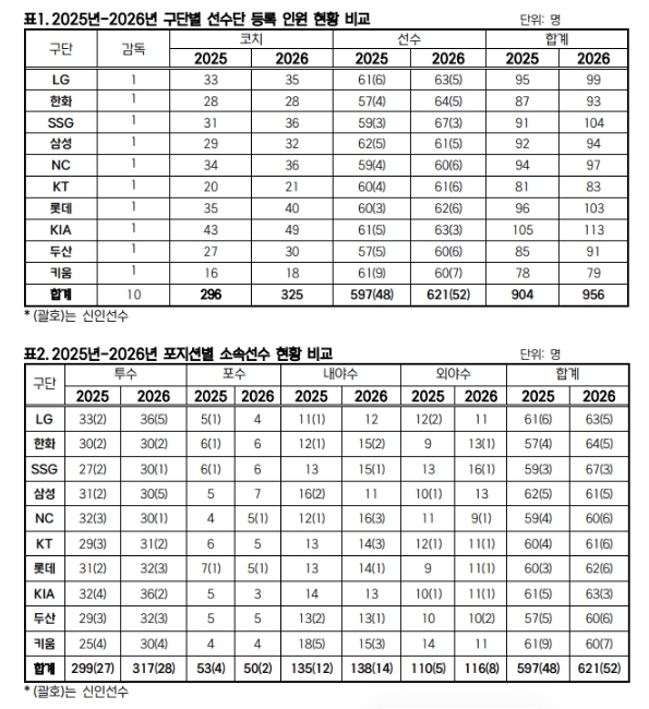 [무한뉴스=최진수 기자] KBO는 2월 10일(화) 2026년 KBO 리그 소속 선수 명단을 공시했다. 10개 구단은 총 621명의 선수를 등록해, 597명이 등록했던 2025년보다 24명이 늘어났다.