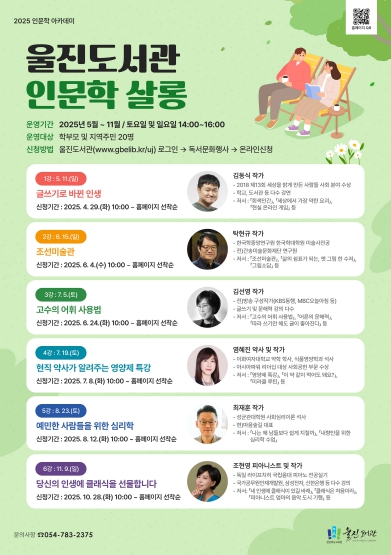 [무한뉴스=최진수 기자] 경상북도교육청 울진도서관은 5월부터 11월까지 학부모 및 지역주민을 대상으로 2025년 인문학 아카데미'울진도서관 인문학 살롱'을 운영한다.