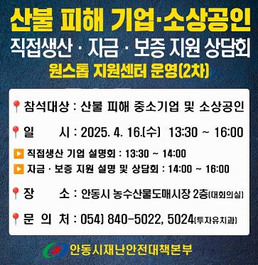 [무한뉴스=최진수 기자] 안동시는 4월 16일 오후 1시 30분부터 4시까지 농수산물도매시장 (풍산읍 유통단지길 100) 2층 대회의실에서 ‘산불피해 기업 · 소상공인 원스톱 지원센터’ 설명회를 개최한다.