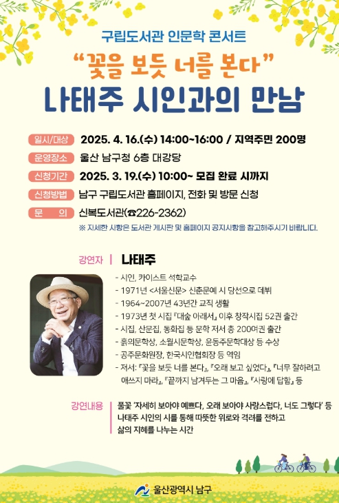 [무한뉴스=최진수 기자] 남구 구립도서관은 16일 남구청 6층 대강당에서 ‘인문학 콘서트’의 첫 번째 강연으로 나태주 시인을 초청해 강연을 개최했다.
