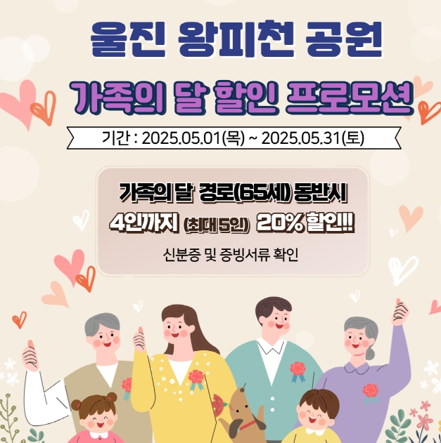 또한, 5월 한 달 동안 왕피천공원 모든 시설을 이용하는 만 65세 이상 어르신과 동반하는 5인까지 20% 특별할인을 진행한다.