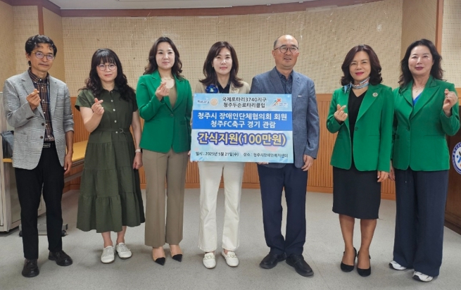 이경은 청주두손로타리클럽 회장은 “우리 회원들이 준비한 간식으로 장애인분들이 더 즐겁게 축구 경기를 관람하면 좋겠다”며 “앞으로도 지속적으로 지역사회에 나눔을 함께하겠다”고 밝혔다.