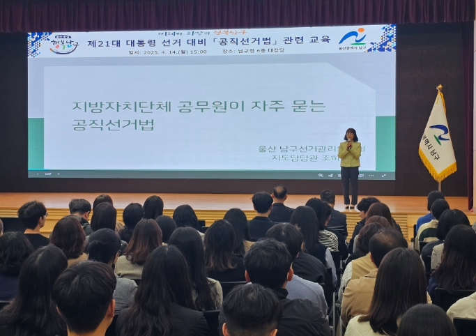 [무한뉴스=최진수 기자] 울산 남구는 오는 6월 3일에 실시하는 제21대 대통령선거를 대비해 15일 남구청 6층 대강당에서 직원 150명을 대상으로 공직선거법 교육을 실시했다.
