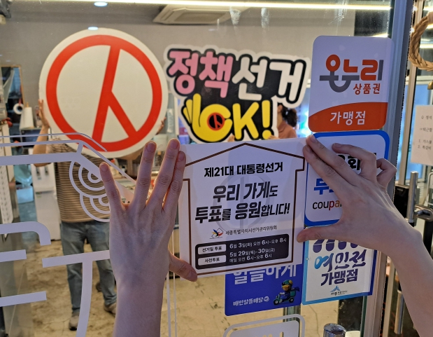 [무한뉴스=정민정 기자] 세종특별자치시선거관리위원회는 오는 6월 3일 실시하는 제21회 대통령선거를 앞두고 지역상인과 상생·협업하는 방식의 ‘우리 가게도 투표를 응원합니다’ 캠페인을 5월 19일부터 5월 22일까지 나성동, 보람동 등 지역 내 상점가를 대상으로 펼쳤다.