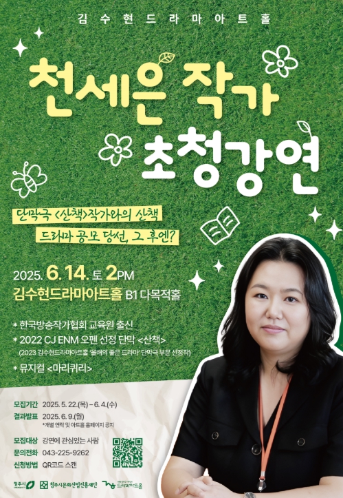 청주시와 청주시문화산업진흥재단이 운영하는 국내 유일의 드라마 문학관 김수현드라마아트홀은 오는 22일부터 다음달 4일 오후 4시까지 ‘천세은 작가 초청강연’ 참여자를 모집한다.