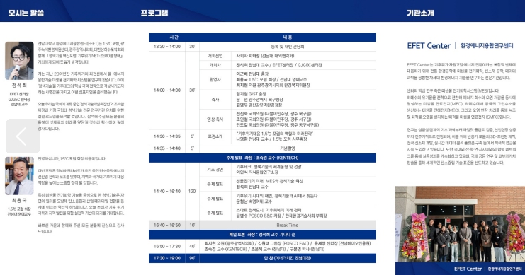 이번 행사는 전남대 환경에너지융합센터(EFET), 1.5℃ 포럼, 대한상하수도학회(KSWW), 광주녹색환경지원센터(GJGEC), 광주광역시의회가 공동으로 주최했다.