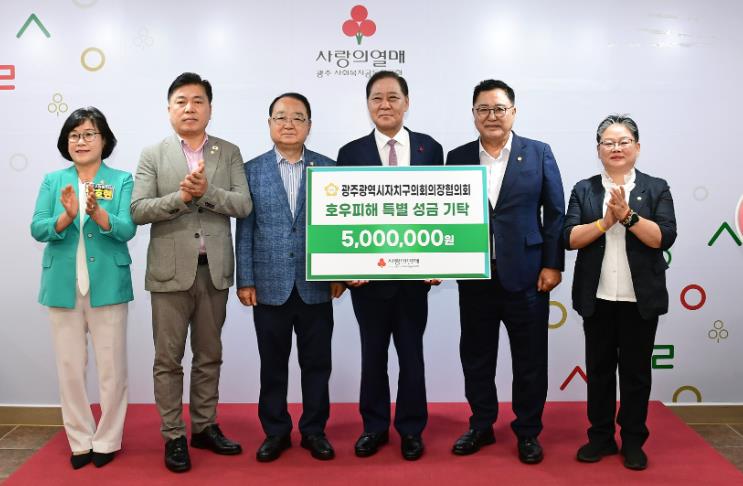 [무한뉴스=정민정 기자] 광주광역시 5개 자치구의회 의장들로 구성된 광주광역시자치구의회의장협의회가 24일 집중호우 피해 복구 성금 500만 원을 광주사회복지공동모금회에 기탁했다.