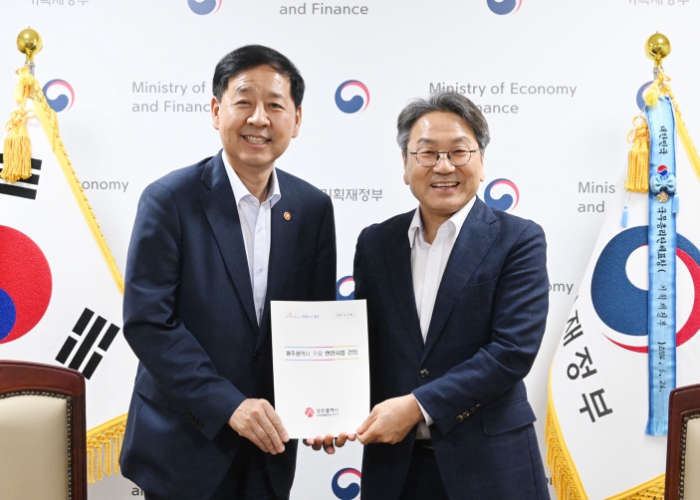 | ▲ 강기정 광주광역시장이 5일 정부서울청사에서 구윤철 경제부총리 겸 기획재정부 장관에게 내년도 광주시 주요 현안사업을 건의한 뒤 기념촬영을 하고 있다. /광주광역시 제공 |