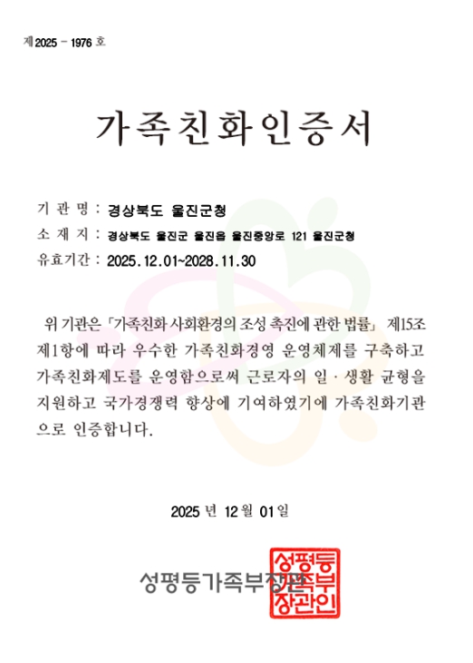 [무한뉴스=최진수 기자] 울진군은 성평등가족부가 주관하는 2025년 가족친화 인증 심사에서 우수한 평가를 받아‘가족친화 재인증’을 획득했다.
