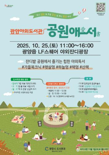 [무한뉴스=정민정 기자] 광양시는 오는 10월 25일 광양읍 LF스퀘어 잔디밭공원에서 자연과 책이 어우러진 『광양 야외도서관–공원애愛서書』 행사를 연다고 밝혔다.