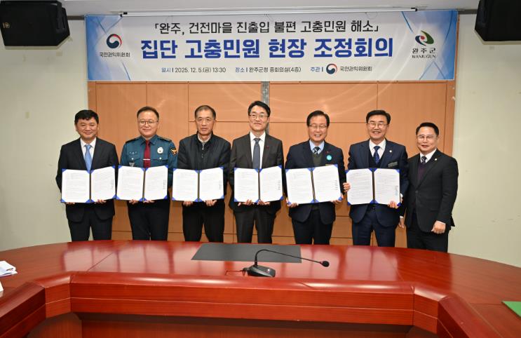 [무한뉴스=정민정 기자] 완주군의회 유의식 의장과 성중기 예산결산특별위원장은 5일 국민권익위원회, 완주군, 완주경찰서, 전주국토관리사무소, 건전마을 주민 대표와 함께 운곡교 인근 교통 불편 해소를 위한 조정안에 최종 합의하고 공식 협약을 체결했다.