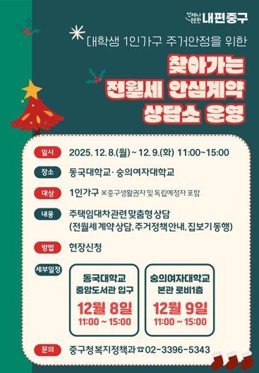 [무한뉴스=정승훈 기자] 서울 중구가 12월 8일과 9일에 동국대학교와 숭의여자대학교에서 대학생 1인 가구의 전월세 계약에 대한 불안과 부담을 덜어줄‘찾아가는 전월세 안심계약 상담소’를 운영한다. 지난 6월에 이은 두 번째 방문이다.