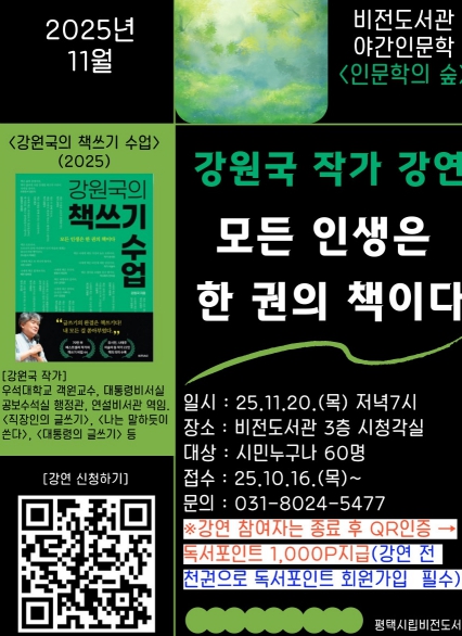 [무한뉴스=정승훈 기자] 평택시 비전도서관은 오는 11월 20일 저녁 7시 '강원국의 책 쓰기 수업'의 강원국 작가를 초청하여 ‘모든 인생은 한 권의 책이다’를 주제로 야간 인문학 강연을 진행한다.