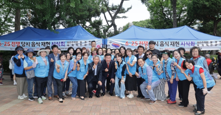 [무한뉴스=정민정 기자] 한국자유총연맹청주시지회(회장 오효진)는 6‧25 전쟁 75주년을 맞아 여성회 주관으로 19일 중앙공원에서 ‘6‧25전쟁 당시 음식재현 시식회 및 안보사진 전시회’를 가졌다.