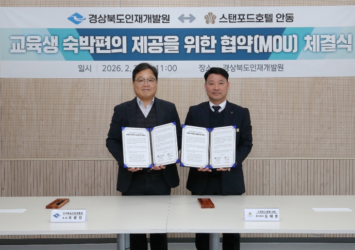 [무한뉴스=최진수 기자] 경상북도인재개발원은 2.2. 인재개발원에서 ‘스텐포드호텔 안동’과 교육생 숙박 편의 제공 및 지역 관광 활성화를 위한 업무협약(MOU)을 체결했다.