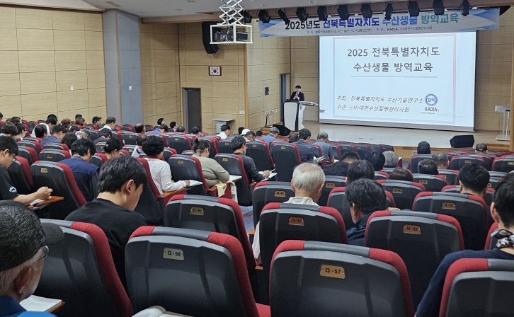 [무한뉴스=정민정 기자] 전북특별자치도 수산기술연구소는 28일 도내 14개 시군의 수산생물양식업자 및 종사자 200여 명을 대상으로 ‘2024년 상반기 수산생물 방역교육’을 실시하고 수산 질병 예방 및 확산 방지를 위한 현장 대응력을 높였다고 밝혔다.