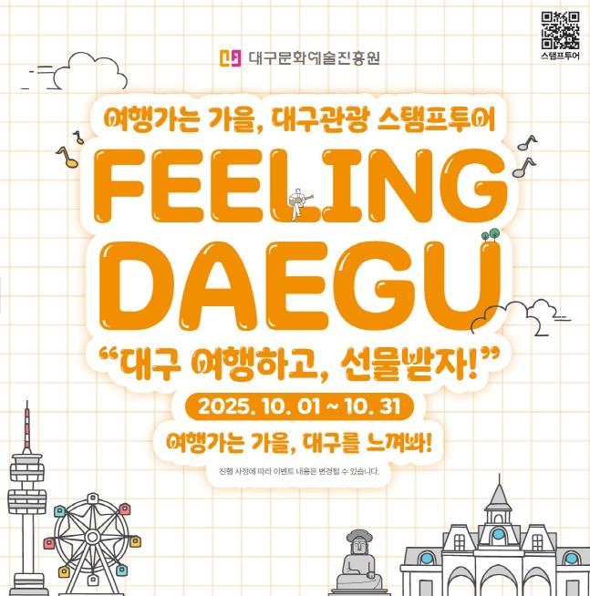 [무한뉴스=최진수 기자] 대구광역시와 대구문예술진흥원관광본부는 문화체육관광부 ‘여행가는 가을’ 캠페인을 연계하여 10월 한 달간 대구를 방문하는 관광객 대상으로 스탬프투어 이벤트를 운영한다.