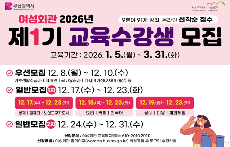 [무한뉴스=최진수 기자] 부산시 여성회관은 내일(8일)부터 '2026년 제1기 교육과정' 수강생을 모집한다고 밝혔다.