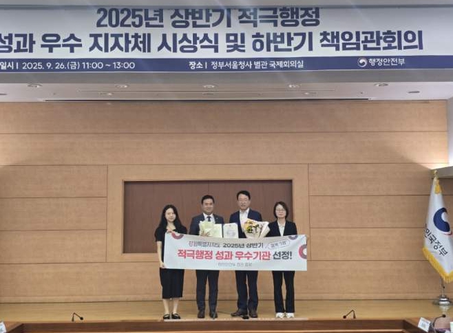 [무한뉴스=정민정 기자] 강원특별자치도가 행정안전부 주관 ‘2025년 상반기 지방자치단체 적극행정 성과 점검’에서 전국 광역자치단체 중 유일하게 우수기관으로 선정돼 행정안전부 장관 표창을 수상했다.