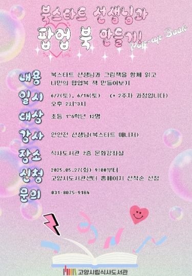[무한뉴스=정승훈 기자] 고양특례시 식사도서관은 어린이 공공도서관 북스타트 연계 프로그램'북스타트 선생님과 함께 만드는 팝업북'을 6월 7일, 14일 오후 2시부터 3시까지 식사도서관 2층 문화강좌실에서 2회차로 진행한다.