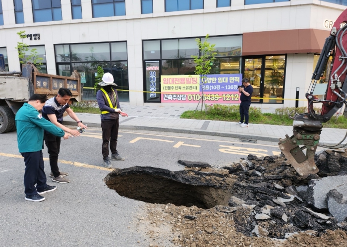 시는 즉시 현장에 출동하고, 보행자와 차량 접근을 통제한 뒤 원인을 규명해 긴급 복구작업을 실시했으며, 현재 도로포장 복구 공사를 진행 중이다.