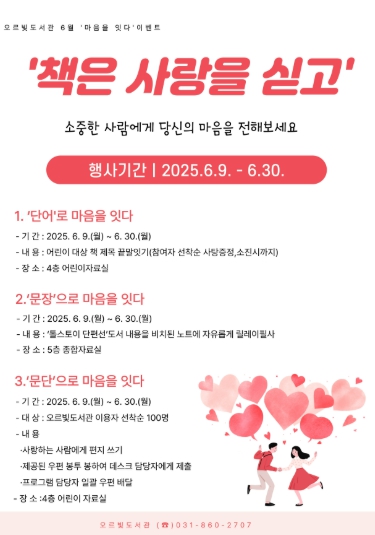 [무한뉴스=정승훈 기자] 동두천시 도서문화사업소 오르빛도서관은 오는 6월 한 달간 ‘마음을 잇다’ 프로그램을 도서관 4, 5층 자료실에서 진행한다고 밝혔다.