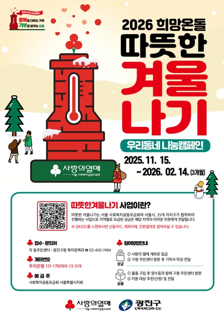 김경호 광진구청장은 “여러분의 따뜻한 정성이 모여 추운 겨울을 버텨야 하는 이웃에게는 큰 힘이 된다”며 “구민 여러분께서 보내주신 귀한 나눔이 우리 동네 어려운 이웃들의 겨울을 지키는 든든한 울타리가 될 수 있도록 많은 관심과 참여를 부탁드린다”라고 말했다.
