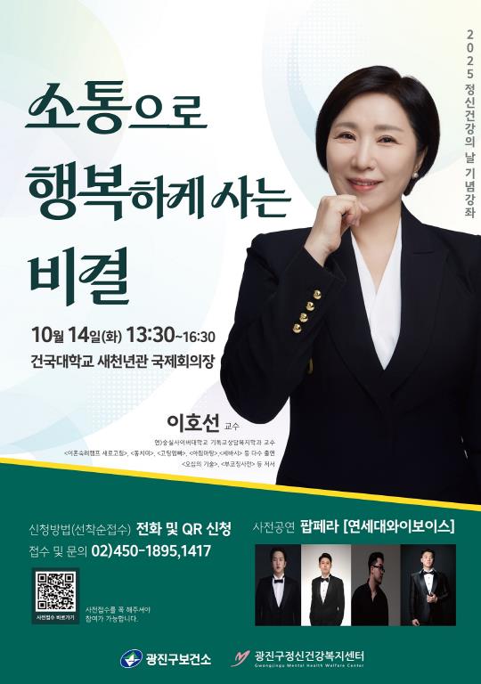 [무한뉴스=박노신 기자] 광진구는 오는 10월 14일 ‘정신건강의 날(매년 10월 10일)’을 맞아 건국대학교 새천년관 국제회의장에서 광진구정신건강복지센터 주관 기념 강좌를 개최한다.