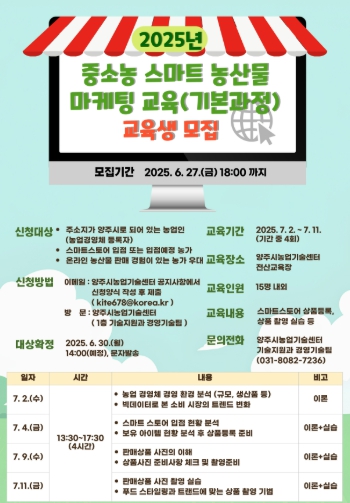 [무한뉴스=정승훈 기자] 양주시가 오는 27일까지 중소농의 스마트 기술 활용과 온라인 마케팅 역량 강화를 위한 ‘2025년 중소농 스마트 농산물 마케팅 교육(기본과정)’ 교육생을 모집한다고 19일 밝혔다.