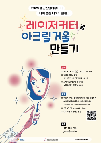 [무한뉴스=정민정 기자] 충남창조경제혁신센터는 오는 6월 13일 2025 충남창업마루나비 팹랩 메이커 클래스 “아크릴 거울 만들기” 교육 프로그램을 운영한다고 밝혔다.