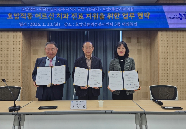[무한뉴스=정민정 기자] 충주시 호암직동행정복지센터(동장 김민남)는 13일 대한노인회 충주시지회 호암직동분회(분회장 유덕상), 호암e좋은치과의원(원장 유희복)과 관내 어르신들의 건강 증진과 의료 접근성 향상을 위한 진료협력 협약을 체결했다.