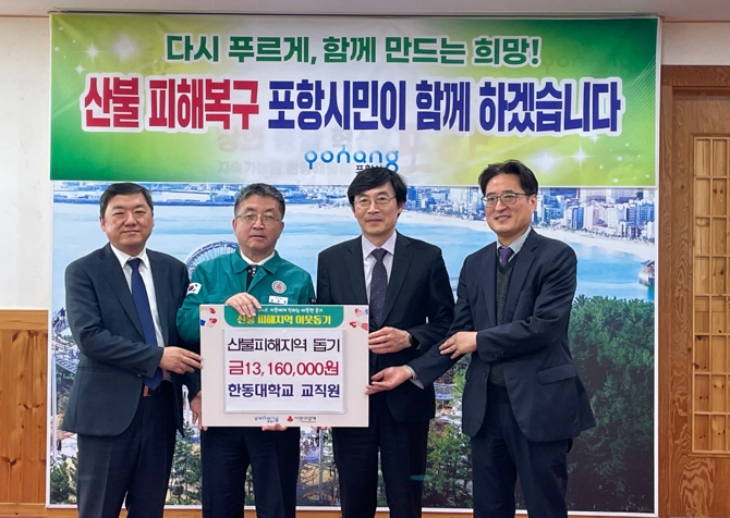 지난 24일 포항시청에서 열린 성금 전달식에서 한동대학교 교직원들은 자발적으로 모은 1,316만 원을 경북 산불 피해 복구 성금으로 전달했다.