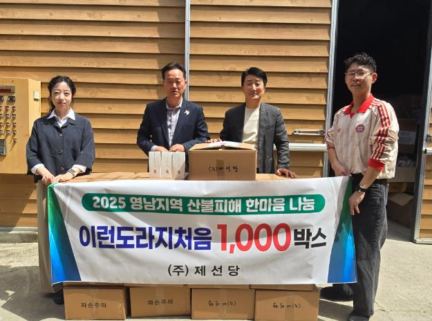 [무한뉴스=최진수 기자] 2025년 4월 17일, 경주 서면 사라리에 위치한 한방건강식품 제조업체 ㈜제선당이 최근 발생한 대형 산불로 피해를 입은 경북 의성군에 자사의 건강보조식품인 ‘이런 도라지처음’ 제품 1,000박스(시가 2천만 원 상당)를 기부했다.
