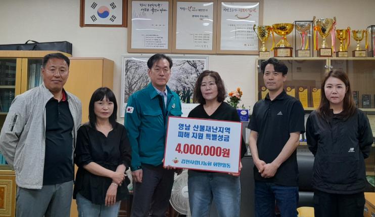 [무한뉴스=최진수 기자] 김천사랑나눔회는 지난 23일 대곡동행정복지센터를 방문하여 최근 발생한 대규모 산불로 피해를 입은 지역의 주민 지원을 위한 성금 400만원을 전달했다.